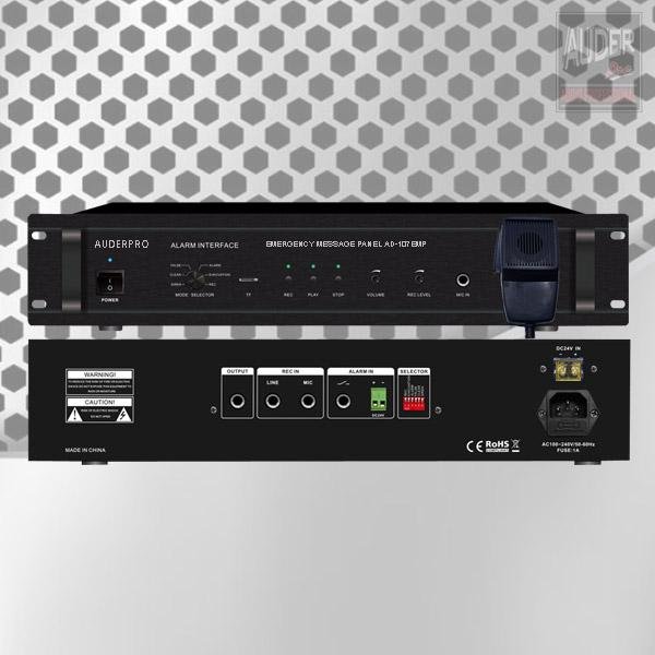 Emergency Message Panel / Evacuation / Alarm AUDERPRO AD-107EMP digunakan dalam sistem alamat publik untuk menghasilkan suara alarm baik dengan sinyal darurat melalui koneksi ke sistem alarm kebakaran atau dengan operasi manual di panel depan, dapat menampilkan 6 mode jenis pesan suara berbeda (SIREN, CLEAR, FALSE, ALARM, EVACUATION, REC).