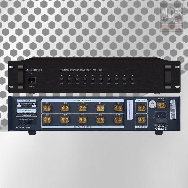 Selektor AUDERPRO AD-210ZS 10 zona speaker selektor memungkinkan penggunaan untuk mendistribusikan sebuah sinyal Amplifier speaker untuk mendengarkan zona yang dapat diaktifkan atau dinonaktifkan. Selektor ini dibagi 2 group masing-masing terdiri 5 zona. Ini dapat dihubung dari 2 unit amplifier input A dan B maupun 1 unit amplifier untuk mengatur semua 10 zona speaker.